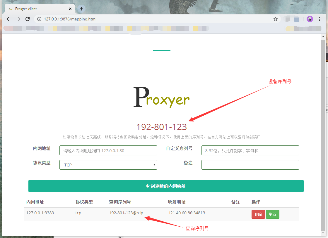 每一台设备都会有一个唯一的设备序列号,每一个映射的端口都会有一查询序列号,您可以使用这个序号在服务器上面查询映射出来的地址。